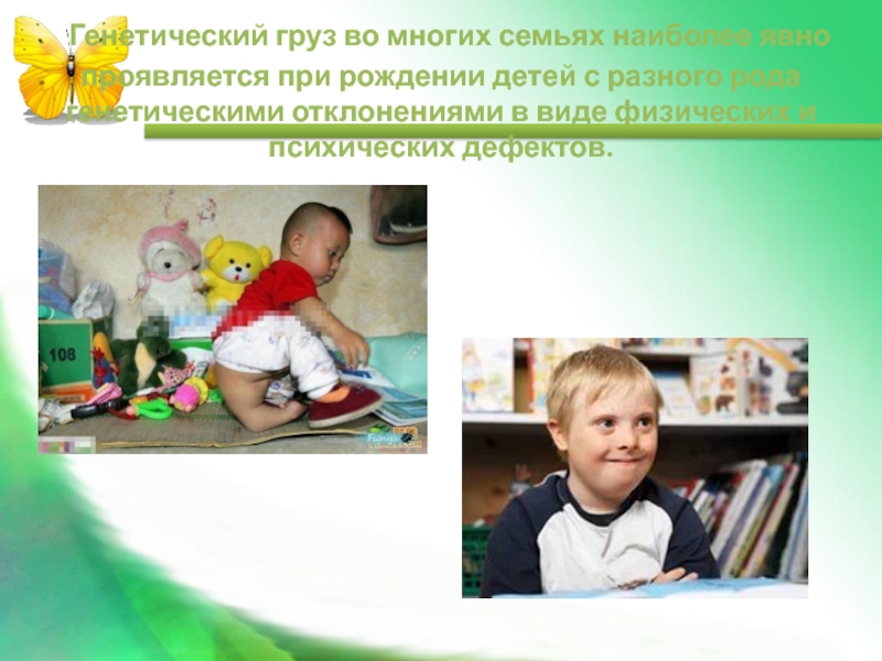 Слайд 21 Генетический груз во многих семьях наиболее явно проявляется при рождении