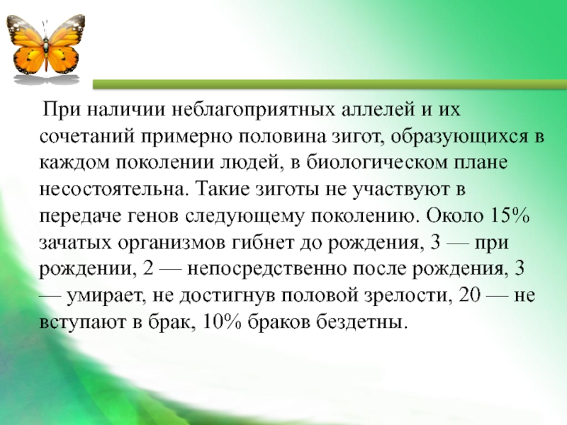 Слайд 20 При наличии неблагоприятных аллелей и их сочетаний примерно половина зигот,