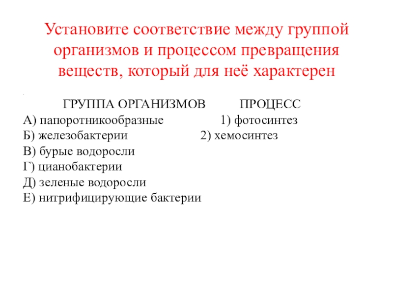 А) папоротникообразные 1) фотосинтез