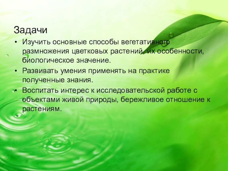 ЗадачиИзучить основные способы вегетативного размножения цветковых растений, их особенности, биологическое значение.Развивать умения применять на практике полученные знания.Воспитать