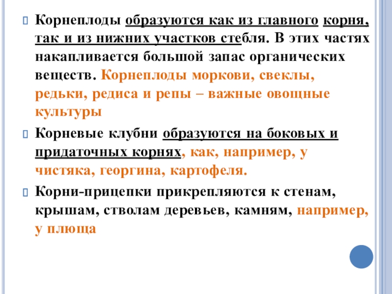 стебля. В этих частях накапливается большой запас органических веществ. Корнеплоды моркови, свеклы, редьки, редиса и репы – важные овощные культуры