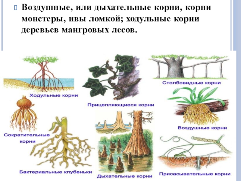 Воздушные, или дыхательные корни, корни монстеры, ивы ломкой; ходульные корни деревьев мангровых лесов.