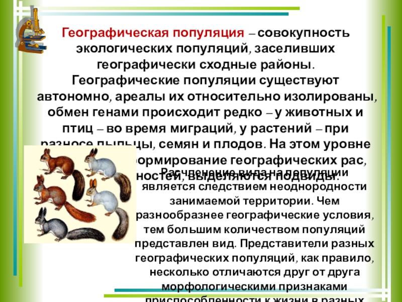 Слайд 9Географическая популяция – совокупность экологических популяций, заселивших географически сходные районы.