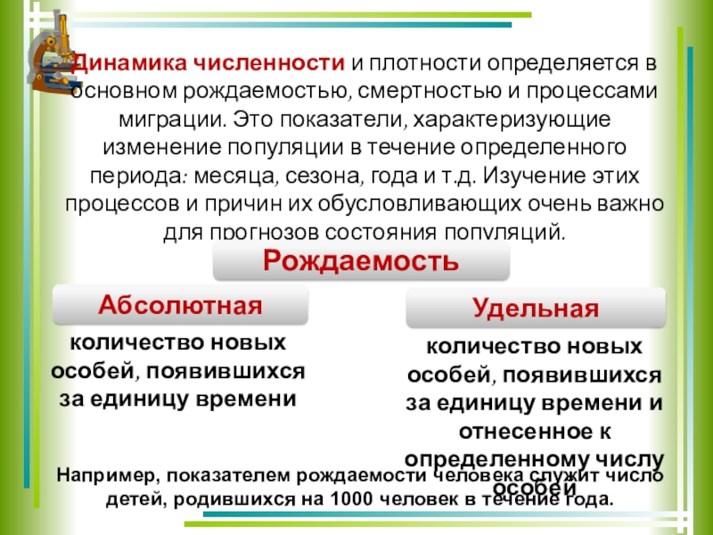 Например, показателем рождаемости человека служит число детей, родившихся на 1000 человек в течение года.