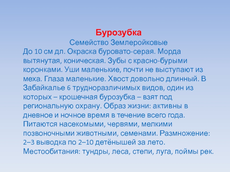 Зубы с красно-бурыми коронками. Уши маленькие, почти не выступают из меха. Глаза маленькие. Хвост довольно длинный. В Забайкалье 6 трудноразличимых видов, один из которых – крошечная бурозубка – взят под региональную охрану. Образ жизни: активны в дневное и ночное время в течение всего года. Питаются насекомыми, червями, мелкими позвоночными животными, семенами. Размножение: 2–3 выводка по 2–10 детёнышей за лето. Местообитания: тундры, леса, степи, луга, поймы рек.