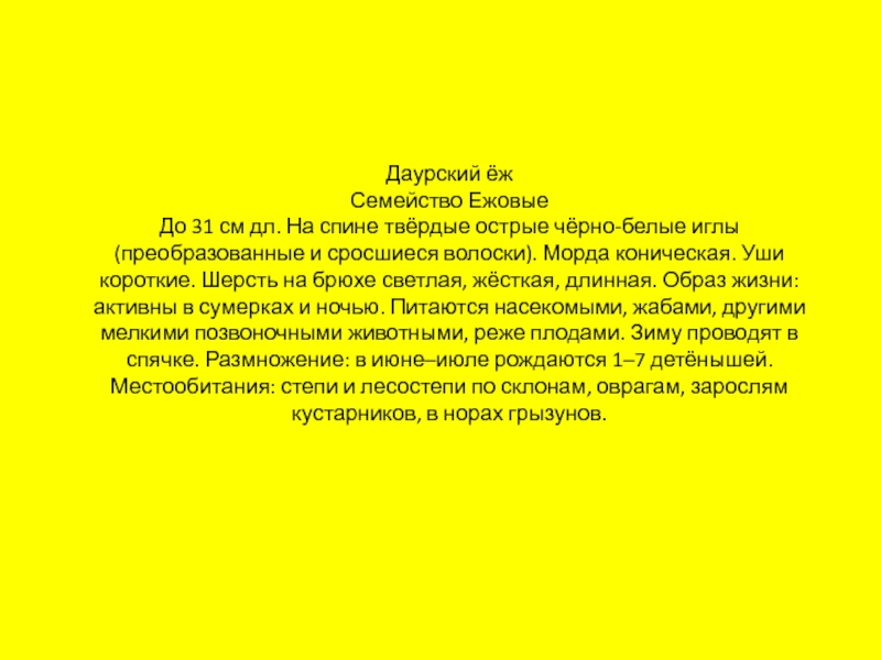 иглы (преобразованные и сросшиеся волоски). Морда коническая. Уши короткие. Шерсть на брюхе светлая, жёсткая, длинная. Образ жизни: активны в сумерках и ночью. Питаются насекомыми, жабами, другими мелкими позвоночными животными, реже плодами. Зиму проводят в спячке. Размножение: в июне–июле рождаются 1–7 детёнышей. Местообитания: степи и лесостепи по склонам, оврагам, зарослям кустарников, в норах грызунов.