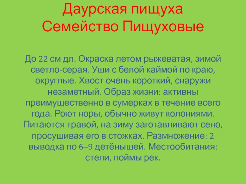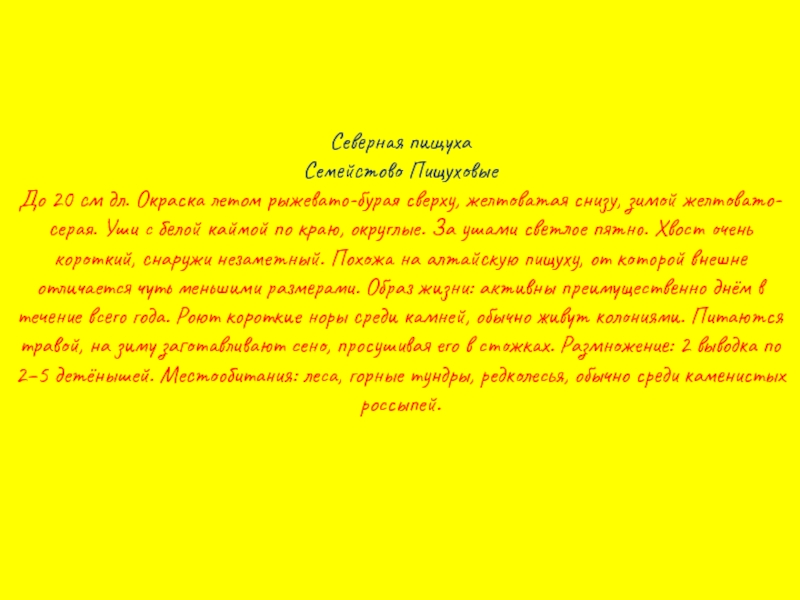 снизу, зимой желтовато-серая. Уши с белой каймой по краю, округлые. За ушами светлое пятно. Хвост очень короткий, снаружи незаметный. Похожа на алтайскую пищуху, от которой внешне отличается чуть меньшими размерами. Образ жизни: активны преимущественно днём в течение всего года. Роют короткие норы среди камней, обычно живут колониями. Питаются травой, на зиму заготавливают сено, просушивая его в стожках. Размножение: 2 выводка по 2–5 детёнышей. Местообитания: леса, горные тундры, редколесья, обычно среди каменистых россыпей.