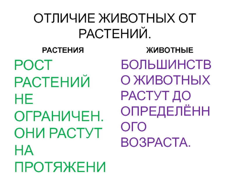 ОТЛИЧИЕ ЖИВОТНЫХ ОТ РАСТЕНИЙ.РАСТЕНИЯРОСТ РАСТЕНИЙ НЕ ОГРАНИЧЕН. ОНИ РАСТУТ НА ПРОТЯЖЕНИИ ВСЕЙ ЖИЗНИ.ЖИВОТНЫЕБОЛЬШИНСТВО ЖИВОТНЫХ РАСТУТ ДО ОПРЕДЕЛЁННОГО