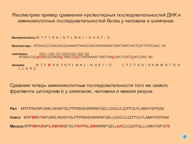 Сравним теперь аминокислотные последовательности того же самого фрагмента цитохрома b у шимпанзе, человека и макаки резуса: