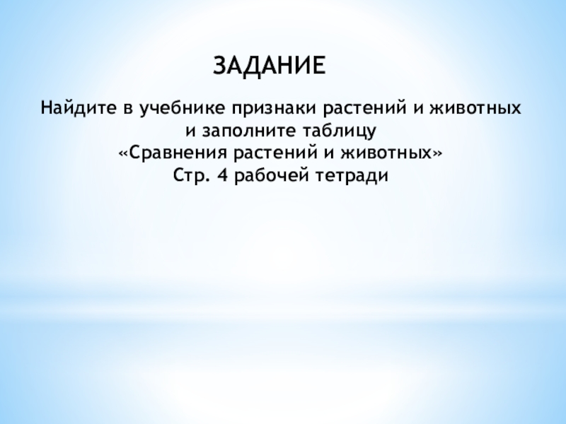 ЗАДАНИЕНайдите в учебнике признаки растений и животных и заполните таблицу«Сравнения растений и животных»Стр. 4 рабочей тетради