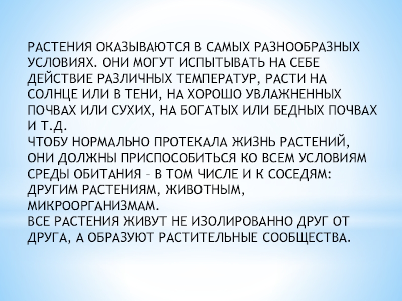ЧТОБУ НОРМАЛЬНО ПРОТЕКАЛА ЖИЗНЬ РАСТЕНИЙ, ОНИ ДОЛЖНЫ ПРИСПОСОБИТЬСЯ КО ВСЕМ УСЛОВИЯМ СРЕДЫ ОБИТАНИЯ – В ТОМ ЧИСЛЕ И К СОСЕДЯМ: ДРУГИМ РАСТЕНИЯМ, ЖИВОТНЫМ, МИКРООРГАНИЗМАМ.