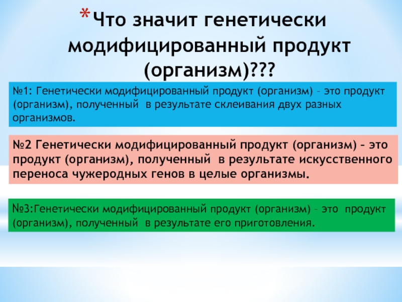 №3:Генетически модифицированный продукт (организм) – это продукт (организм), полученный в результате его приготовления.
