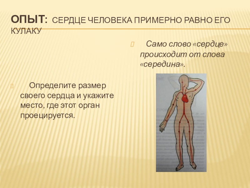 Слайд 15Опыт: Сердце человека примерно равно его кулаку