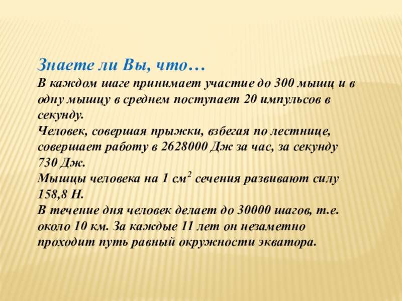 9. Человек в течение дня делает до 30 000 шагов, то есть проходит около 20 км. За каждые 5,5 лет он незаметно совершает путь, равный длине экватора.
