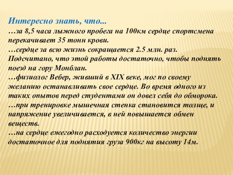 …сердце за всю жизнь сокращается 2.5 млн. раз. Подсчитано, что этой работы достаточно, чтобы поднять поезд на гору Монблан.