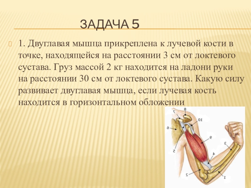 1. Двуглавая мышца прикреплена к лучевой кости в точке, находящейся на расстоянии 3 см от локтевого сустава. Груз массой 2 кг находится на ладони руки на расстоянии 30 см от локтевого сустава. Какую силу развивает двуглавая мышца, если лучевая кость находится в горизонтальном обложении