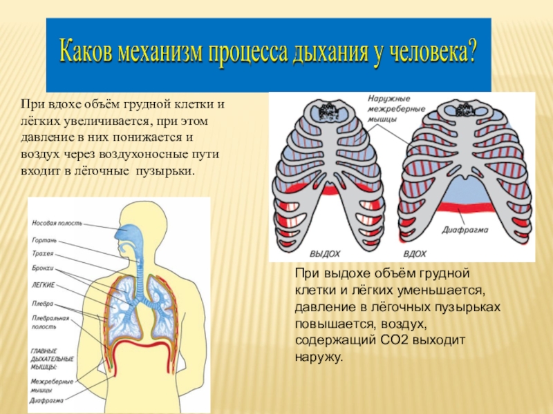 Слайд 12При вдохе объём грудной клетки и лёгких увеличивается, при этом давление