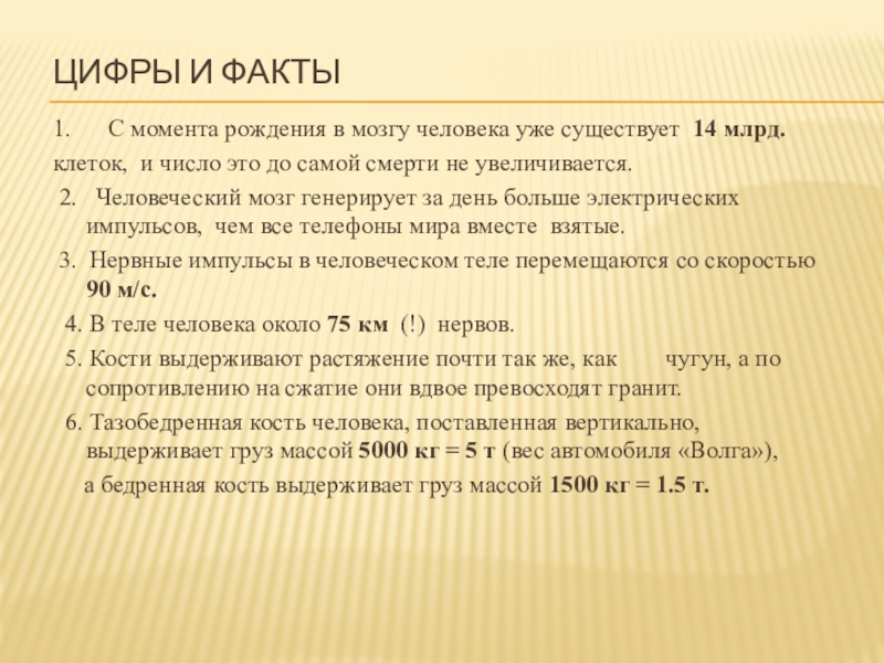 6. Тазобедренная кость человека, поставленная вертикально, выдерживает груз массой 5000 кг = 5 т (вес автомобиля «Волга»),