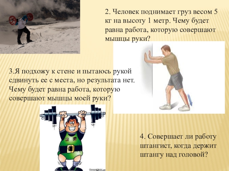 Слайд 222. Человек поднимает груз весом 5 кг на высоту 1 метр.