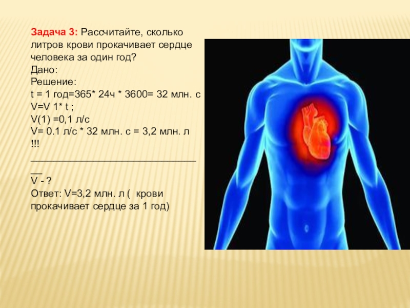 Слайд 16Задача 3: Рассчитайте, сколько литров крови прокачивает сердце человека за один