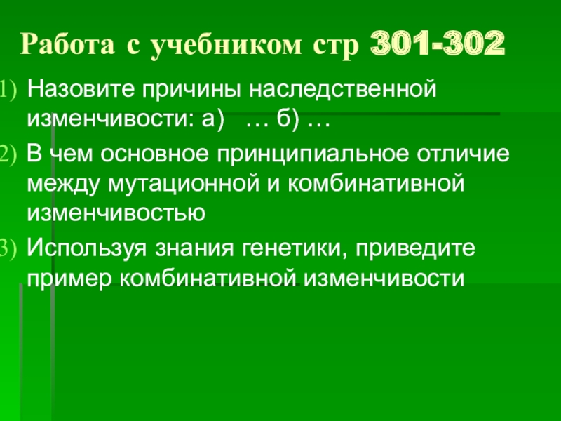 Работа с учебником стр 301-302Назовите причины наследственной изменчивости: а)  … б) …В чем основное принципиальное отличие
