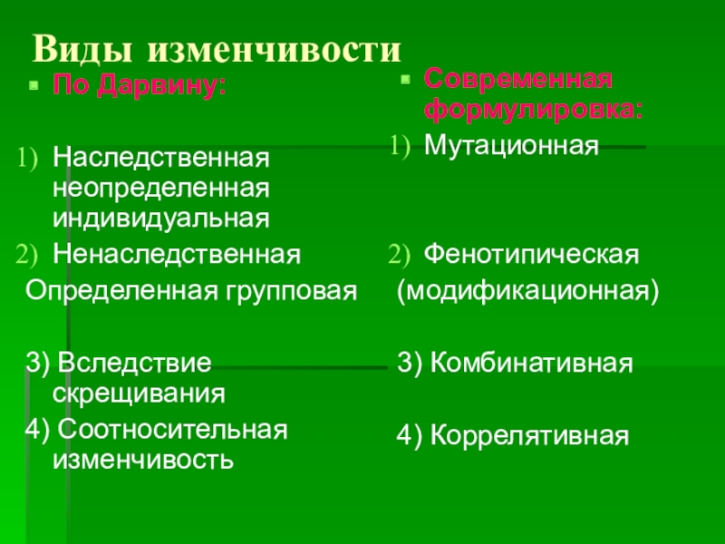 Виды изменчивостиПо Дарвину:Наследственная неопределенная индивидуальнаяНенаследственнаяОпределенная групповая3) Вследствие скрещивания4) Соотносительная изменчивостьСовременная формулировка:МутационнаяФенотипическая (модификационная)3) Комбинативная4) Коррелятивная