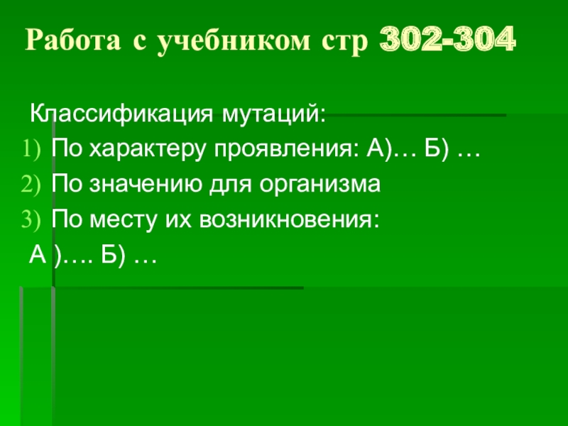 Работа с учебником стр 302-304Классификация мутаций:По характеру проявления: А)… Б) …По значению для организмаПо месту их возникновения:А