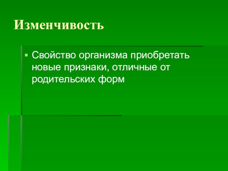 Изменчивость Свойство организма приобретать новые признаки, отличные от родительских форм
