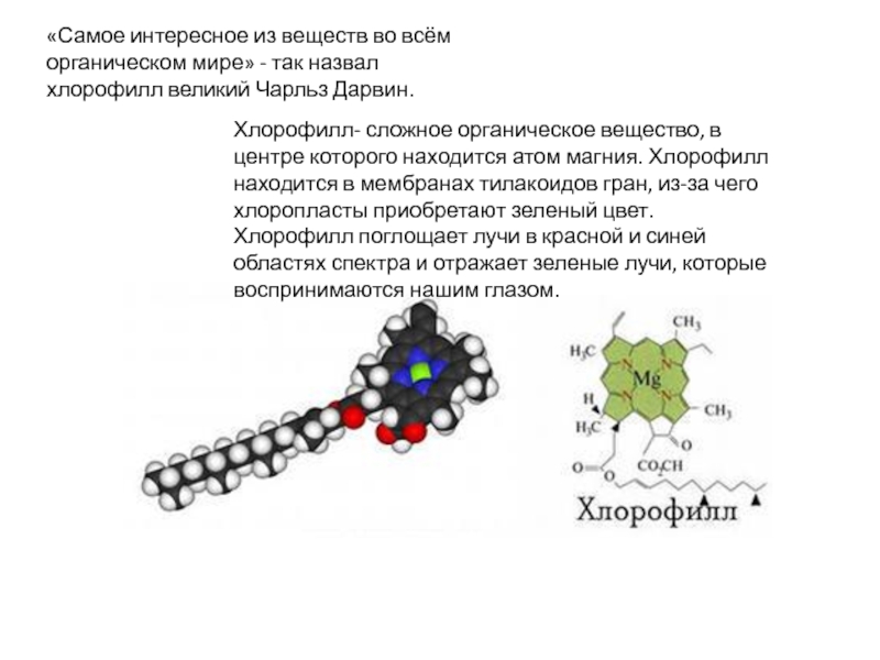 Хлорофилл- сложное органическое вещество, в центре которого находится атом магния. Хлорофилл находится в мембранах тилакоидов гран, из-за чего хлоропласты приобретают зеленый цвет. Хлорофилл поглощает лучи в красной и синей областях спектра и отражает зеленые лучи, которые воспринимаются нашим глазом.