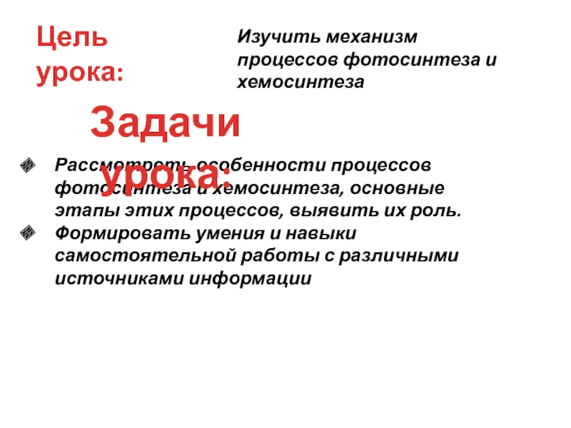 Изучить механизм процессов фотосинтеза и хемосинтеза
