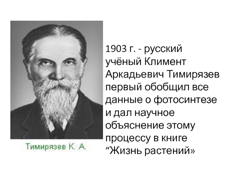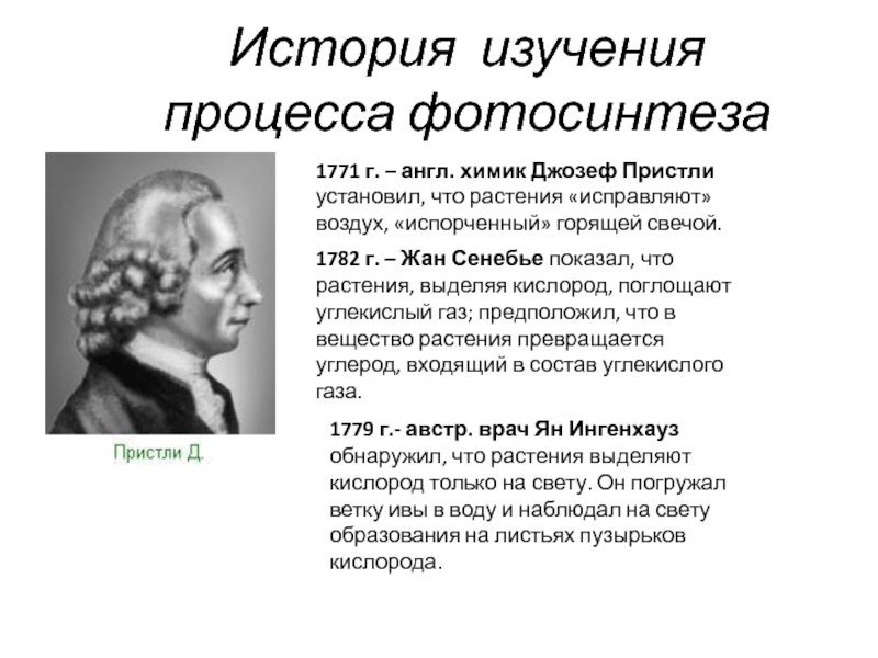 1782 г. – Жан Сенебье показал, что растения, выделяя кислород, поглощают углекислый газ; предположил, что в вещество растения превращается углерод, входящий в состав углекислого газа.