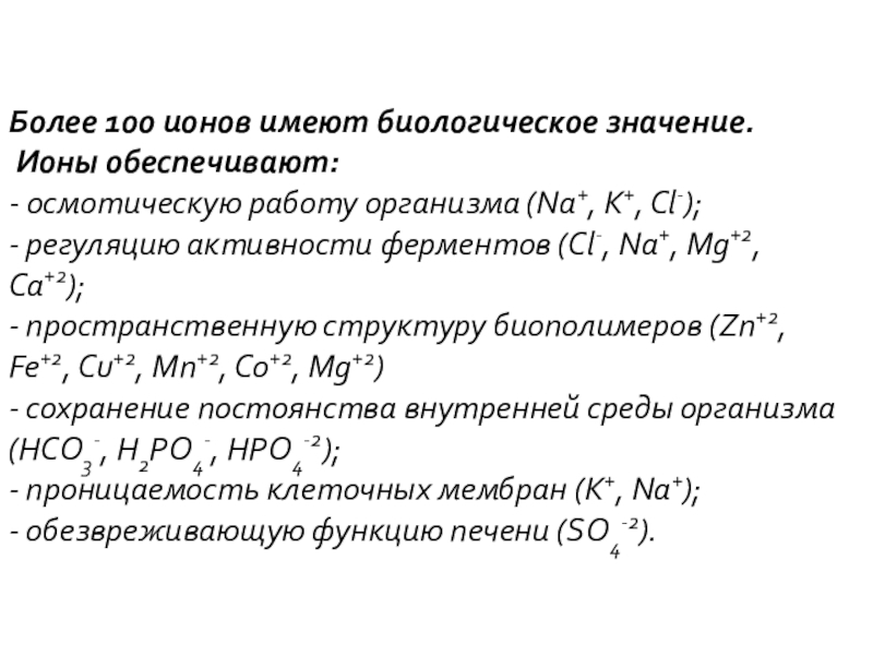 Более 100 ионов имеют биологическое значение. Ионы обеспечивают:- осмотическую работу организма (Nа+, К+, Cl-);- регуляцию активности ферментов