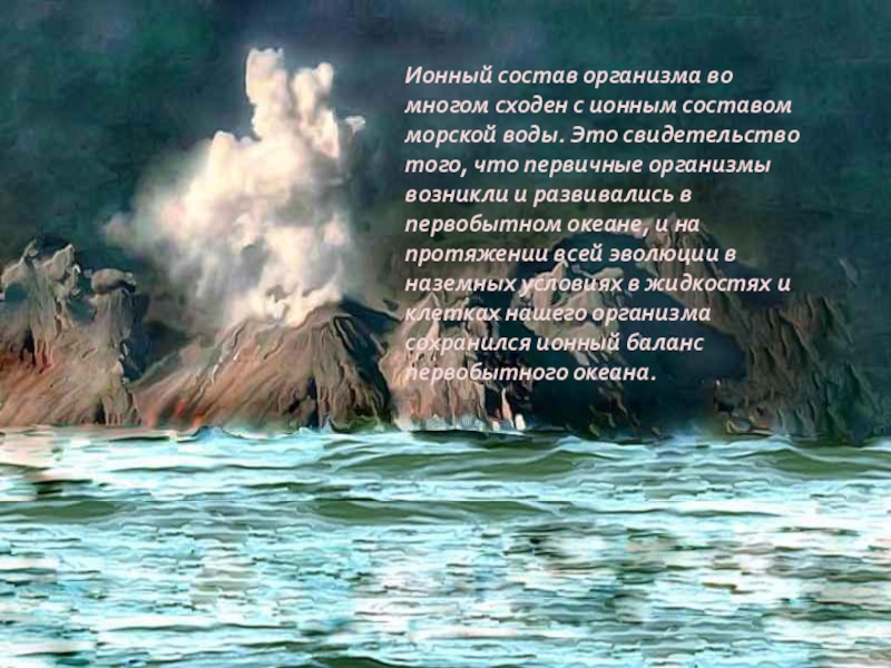 Ионный состав организма во многом сходен с ионным составом морской воды. Это свидетельство того, что первичные организмы