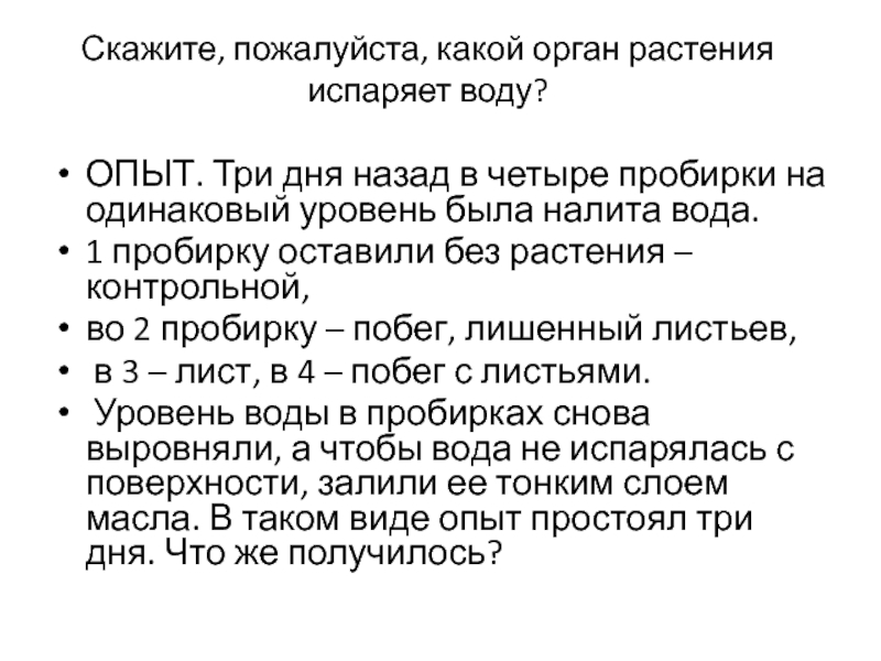 Скажите, пожалуйста, какой орган растения испаряет воду?