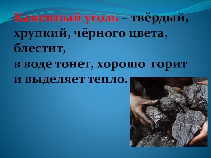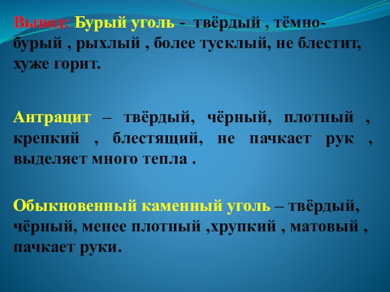 Вывод: Бурый уголь - твёрдый , тёмно-бурый , рыхлый , более тусклый, не блестит, хуже горит.