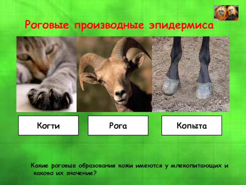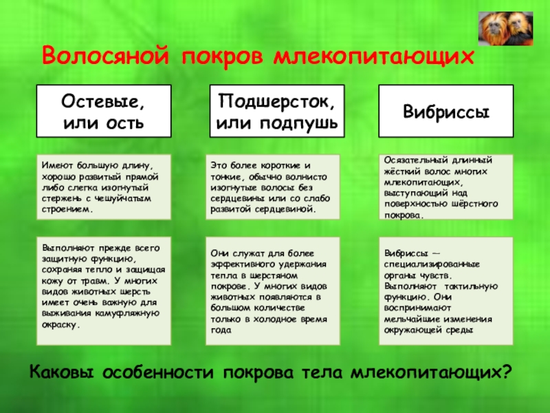 Выполняют прежде всего защитную функцию, сохраняя тепло и защищая кожу от травм. У многих видов животных шерсть имеет очень важную для выживания камуфляжную окраску.