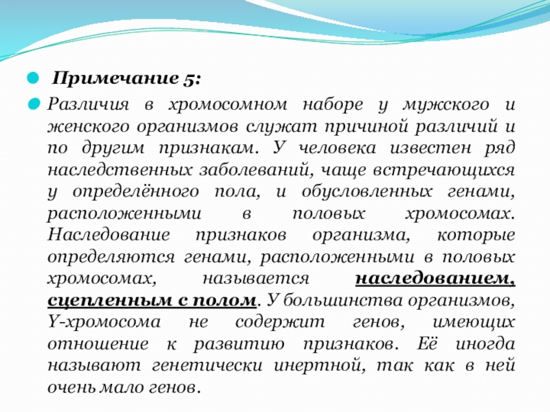 служат причиной различий и по другим признакам. У человека известен ряд наследственных заболеваний, чаще встречающихся у определённого пола, и обусловленных генами, расположенными в половых хромосомах. Наследование признаков организма, которые определяются генами, расположенными в половых хромосомах, называется наследованием, сцепленным с полом. У большинства организмов, Y-хромосома не содержит генов, имеющих отношение к развитию признаков. Её иногда называют генетически инертной, так как в ней очень мало генов.