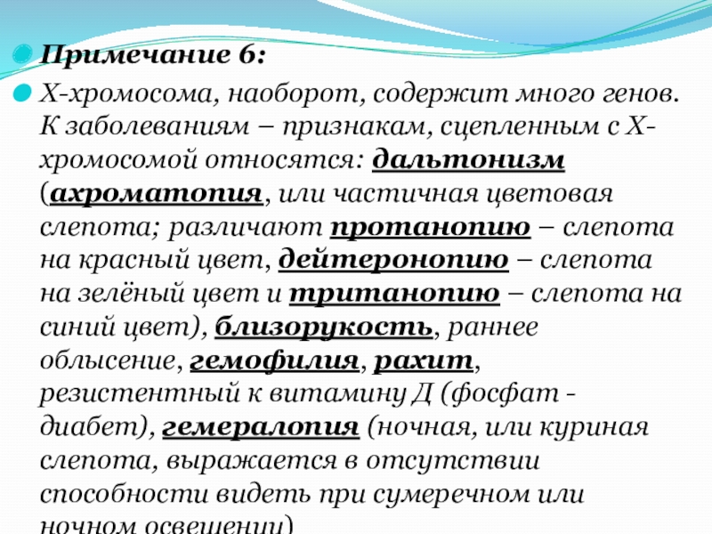 с Х-хромосомой относятся: дальтонизм (ахроматопия, или частичная цветовая слепота; различают протанопию – слепота на красный цвет, дейтеронопию – слепота на зелёный цвет и тританопию – слепота на синий цвет), близорукость, раннее облысение, гемофилия, рахит, резистентный к витамину Д (фосфат - диабет), гемералопия (ночная, или куриная слепота, выражается в отсутствии способности видеть при сумеречном или ночном освещении)