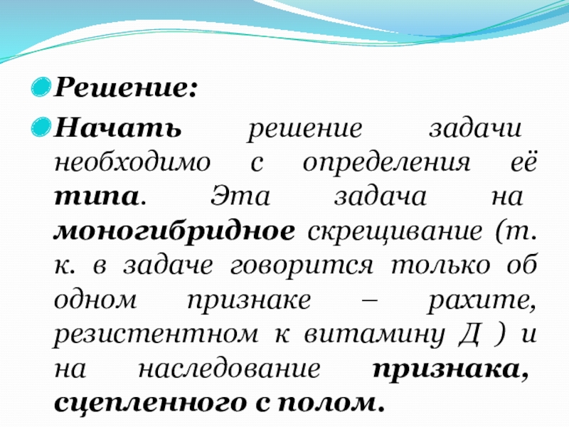 моногибридное скрещивание (т.к. в задаче говорится только об одном признаке – рахите, резистентном к витамину Д ) и на наследование признака, сцепленного с полом.