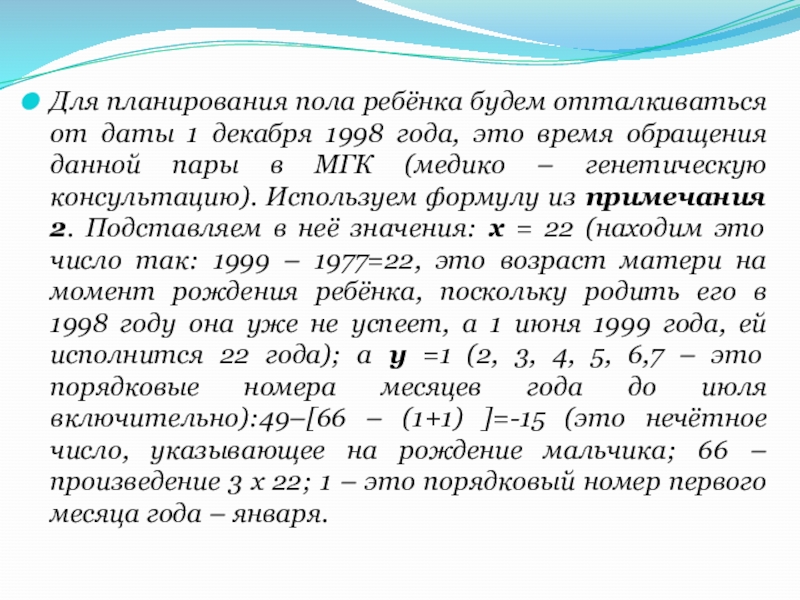 года, это время обращения данной пары в МГК (медико – генетическую консультацию). Используем формулу из примечания 2. Подставляем в неё значения: х = 22 (находим это число так: 1999 – 1977=22, это возраст матери на момент рождения ребёнка, поскольку родить его в 1998 году она уже не успеет, а 1 июня 1999 года, ей исполнится 22 года); а y =1 (2, 3, 4, 5, 6,7 – это порядковые номера месяцев года до июля включительно):49–[66 – (1+1) ]=-15 (это нечётное число, указывающее на рождение мальчика; 66 – произведение 3 х 22; 1 – это порядковый номер первого месяца года – января.