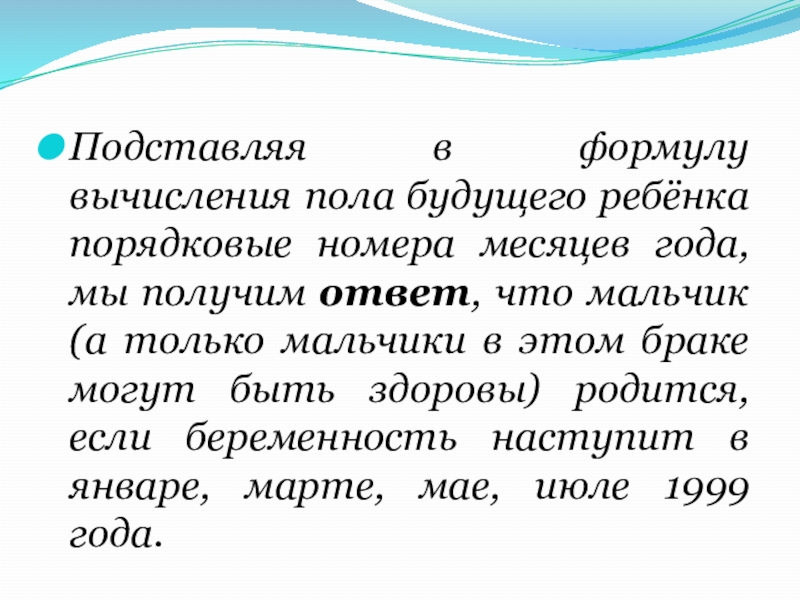 Слайд 16Подставляя в формулу вычисления пола будущего ребёнка порядковые номера месяцев года,