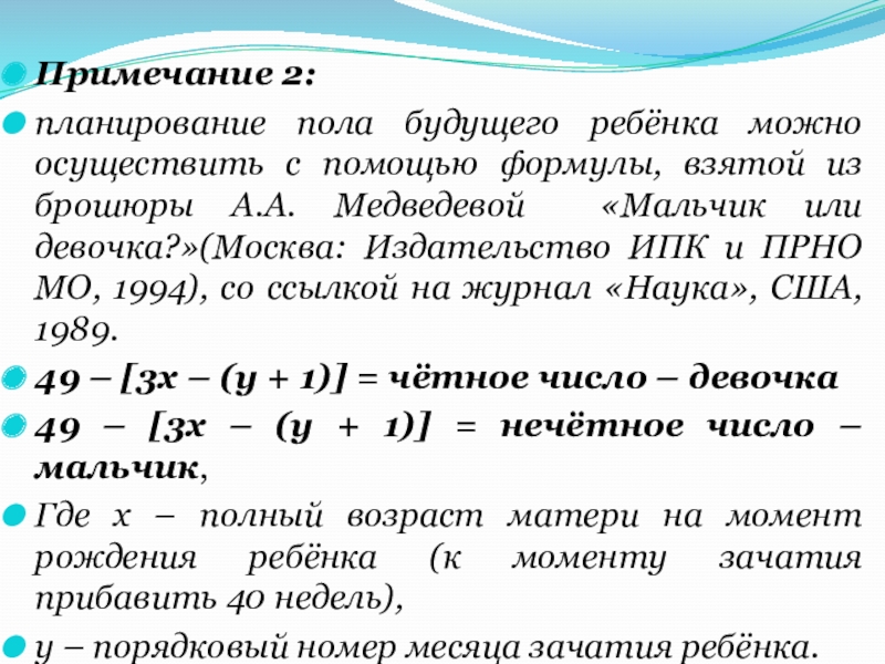 Где х – полный возраст матери на момент рождения ребёнка (к моменту зачатия прибавить 40 недель),