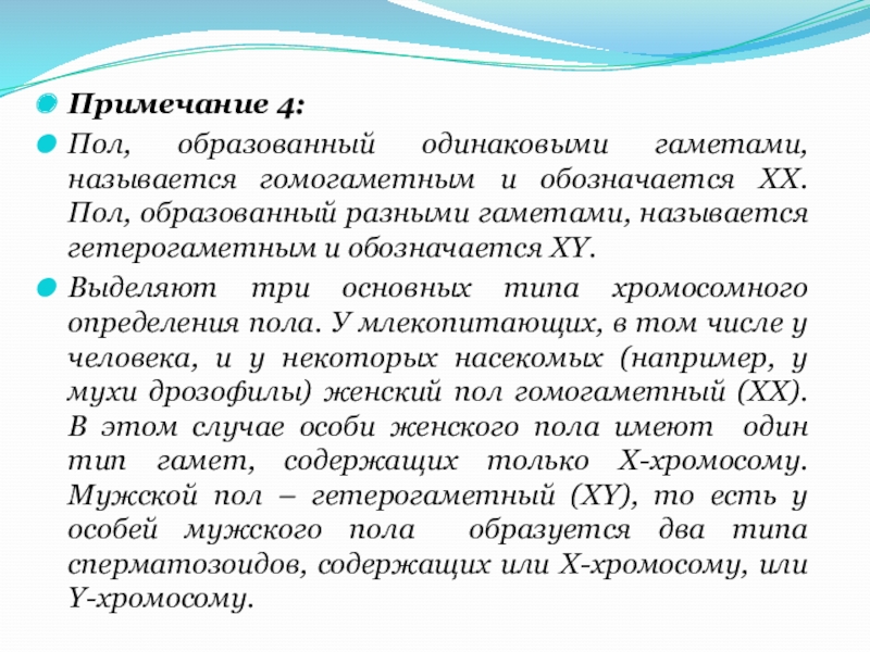 Выделяют три основных типа хромосомного определения пола. У млекопитающих, в том числе у человека, и у некоторых насекомых (например, у мухи дрозофилы) женский пол гомогаметный (ХХ). В этом случае особи женского пола имеют один тип гамет, содержащих только Х-хромосому. Мужской пол – гетерогаметный (ХY), то есть у особей мужского пола образуется два типа сперматозоидов, содержащих или Х-хромосому, или Y-хромосому.