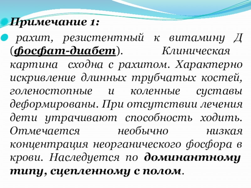 с рахитом. Характерно искривление длинных трубчатых костей, голеностопные и коленные суставы деформированы. При отсутствии лечения дети утрачивают способность ходить. Отмечается необычно низкая концентрация неорганического фосфора в крови. Наследуется по доминантному типу, сцепленному с полом.