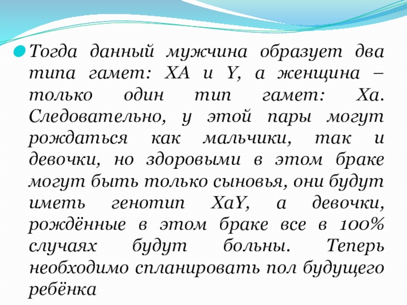 женщина – только один тип гамет: Ха. Следовательно, у этой пары могут рождаться как мальчики, так и девочки, но здоровыми в этом браке могут быть только сыновья, они будут иметь генотип ХаY, а девочки, рождённые в этом браке все в 100% случаях будут больны. Теперь необходимо спланировать пол будущего ребёнка