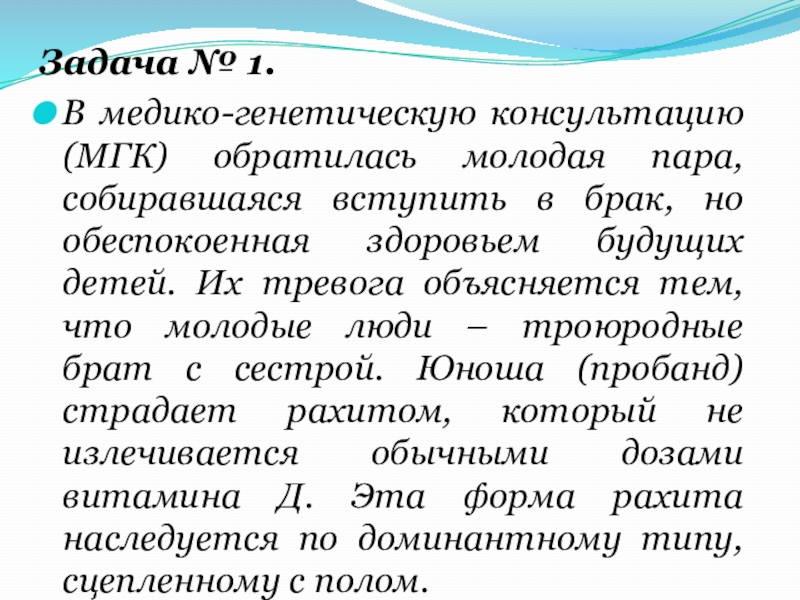 вступить в брак, но обеспокоенная здоровьем будущих детей. Их тревога объясняется тем, что молодые люди – троюродные брат с сестрой. Юноша (пробанд) страдает рахитом, который не излечивается обычными дозами витамина Д. Эта форма рахита наследуется по доминантному типу, сцепленному с полом.