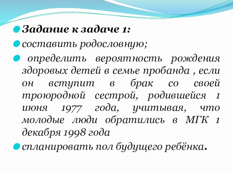 в семье пробанда , если он вступит в брак со своей троюродной сестрой, родившейся 1 июня 1977 года, учитывая, что молодые люди обратились в МГК 1 декабря 1998 года