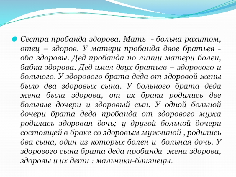 Слайд 3Сестра пробанда здорова. Мать - больна рахитом, отец – здоров. У