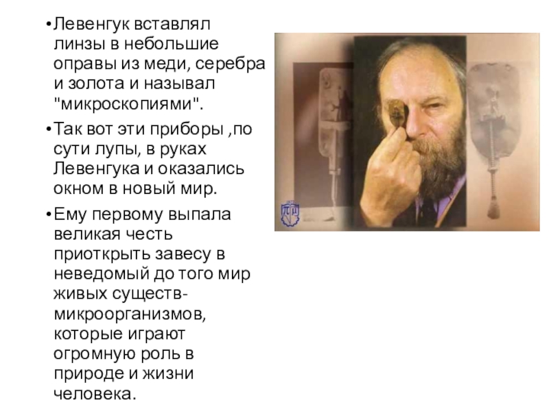Так вот эти приборы ,по сути лупы, в руках Левенгука и оказались окном в новый мир.