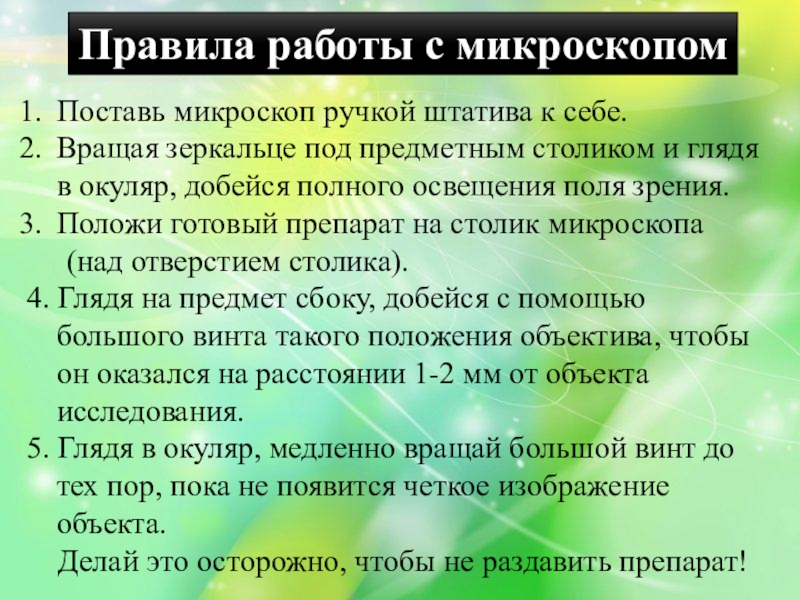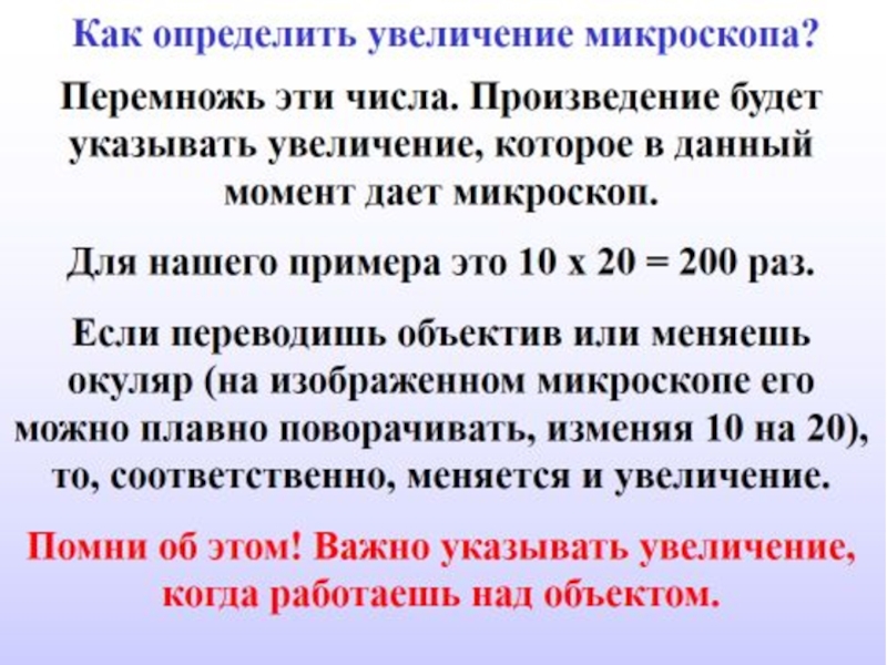 4. Глядя на предмет сбоку, добейся с помощью большого винта такого положения объектива, чтобы он оказался на расстоянии 1-2 мм от объекта исследования.